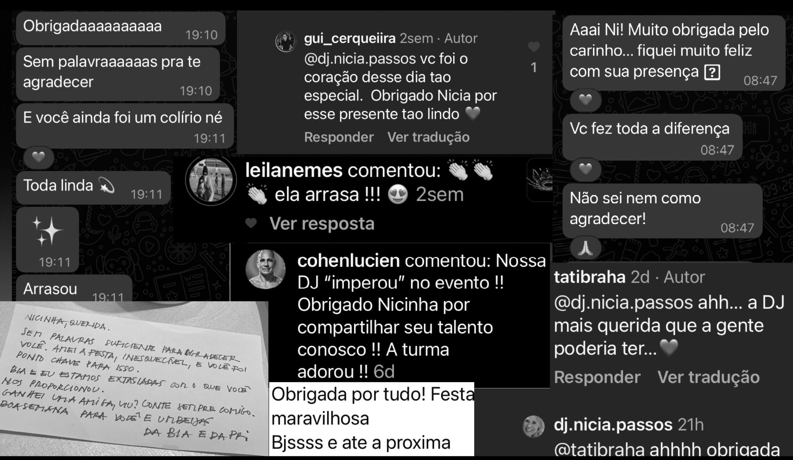 "Profissional extremamente competente, dedicada e comprometida com a excelência em cada detalhe. A DJ Nicia Passos tem uma leitura de pista impecável, sensibilidade musical apurada e uma condução técnica de altíssimo nível. Sempre pontual, organizada e atenta às necessidades do cliente, entrega não apenas música, mas experiências memoráveis. Seu profissionalismo, aliado à paixão pelo que faz, transforma qualquer evento em um sucesso absoluto. Recomendo com total segurança e confiança." Philippe Suplicy